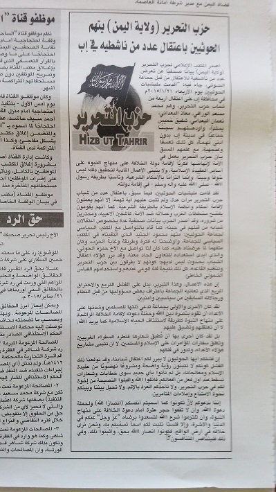 اصدر المكتب الاعلامي لحزب التحرير في ولاية اليمن بيانا صحفيا ادان فيه اعتقال مليشيا الحوثيين لخمسة من اعضائه في محافظة اب .