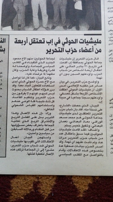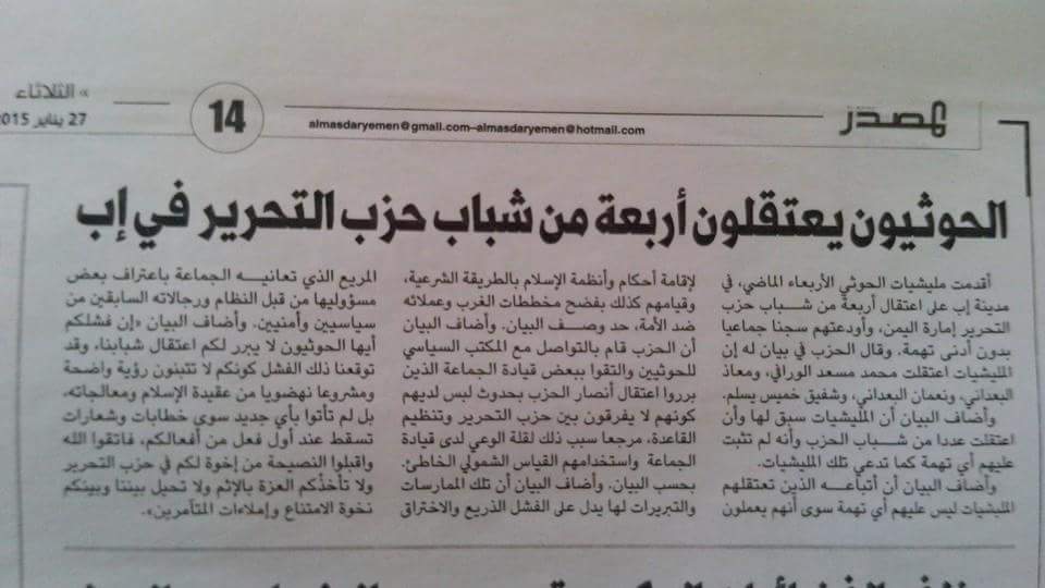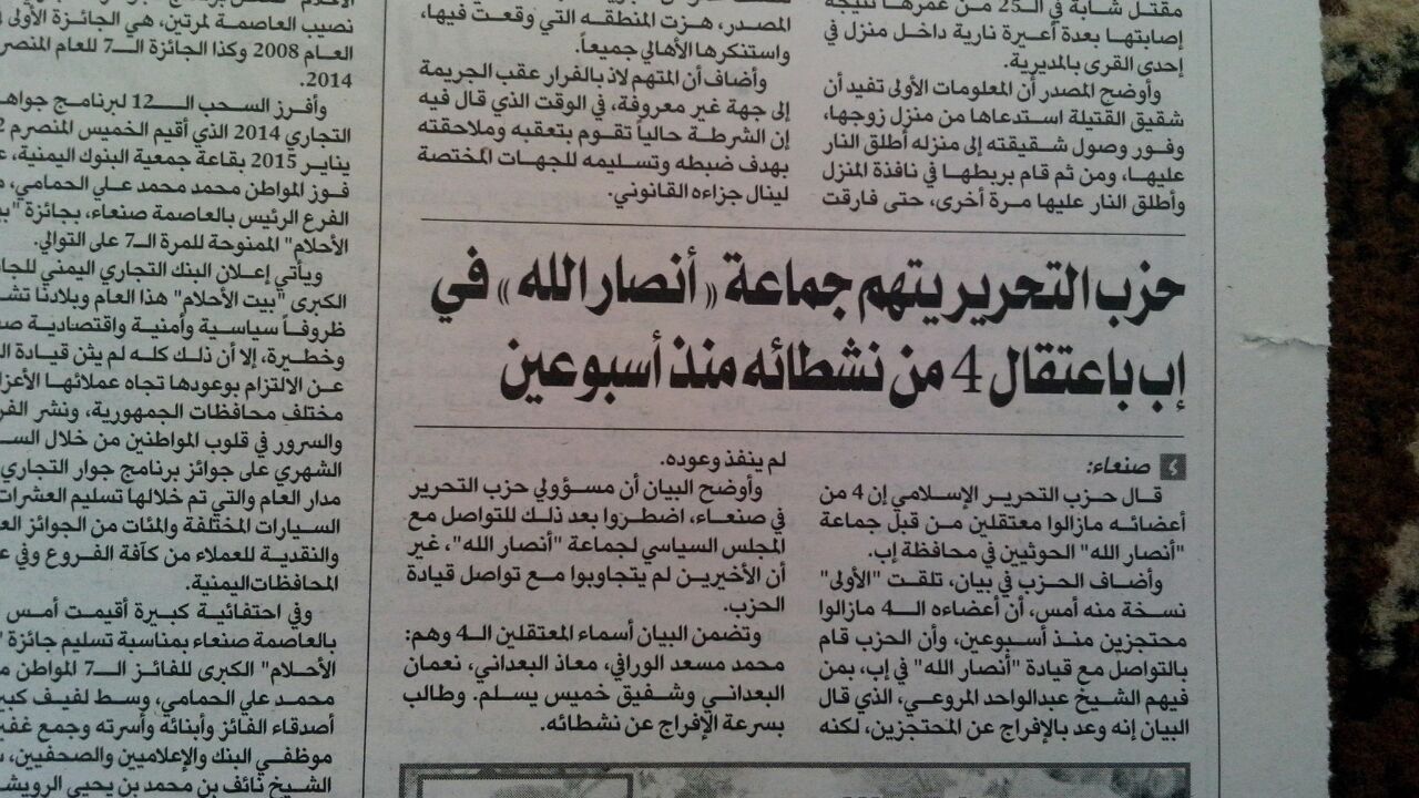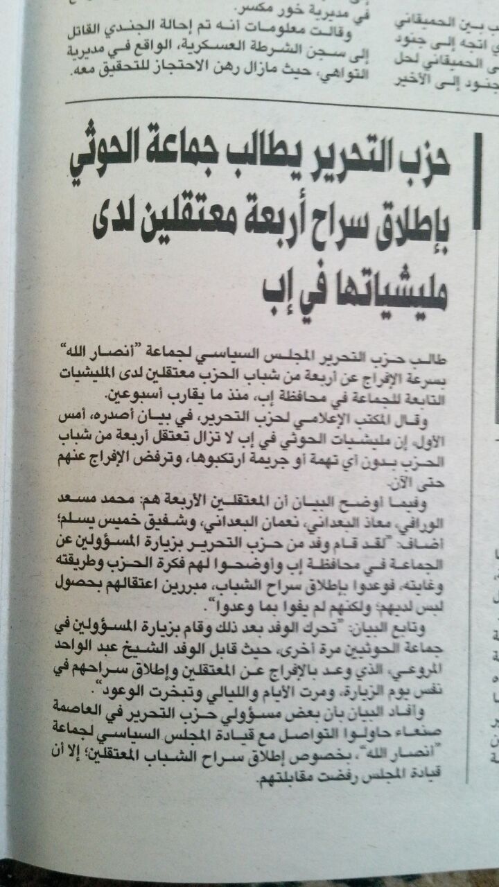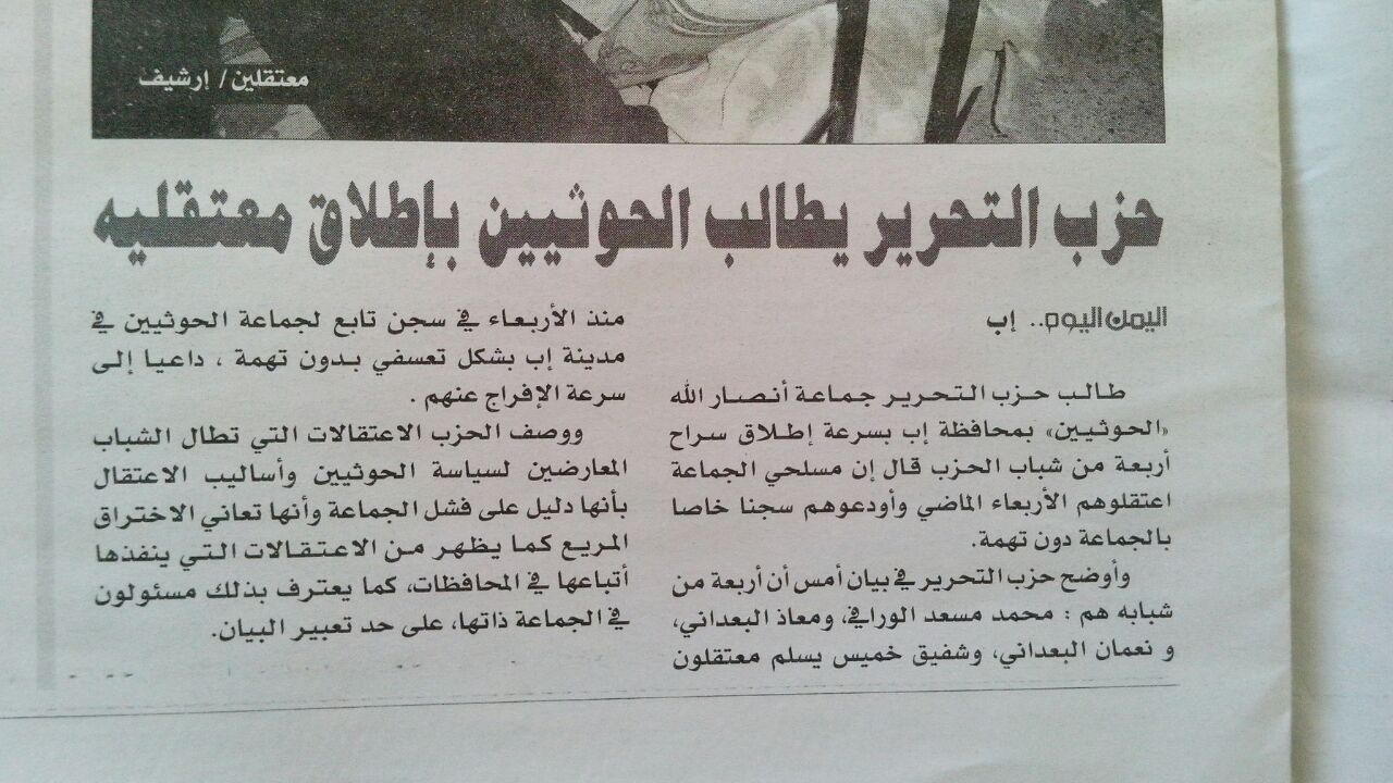 أقدمت مليشيات الحوثيين يوم الأربعاء 21/1/2015م في محافظة إب على اعتقال خمسة من شباب حزب التحرير وهم: (الأخ محمد مسعد الورافي، وابن أخيه، والأخ معاذ البعداني، والأخ نعمان البعداني، والأخ شفيق خميس يسلم)، وأودعتهم سجنا جماعيا في مدينة إب بدون أدنى تهمة، كل ذلك تعسفاً وعنجهية؛ مع علمهم المسبق بأن حزب التحرير يعمل في الأمة لإنهاضها فكرياً لإقامة دولة الخلافة على منهاج النبوة على أساس العقيدة الإسلامية ولا يتبنى الأعمال المادية لتحقيق ذلك؛ ليس خوفاً وجبناً وإنما التزاماً بالأحكام الشرعية، وتأسياً بطريقة رسول الله صلى الله عليه وآله وسلم في إقامة دولته.