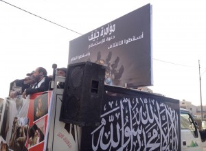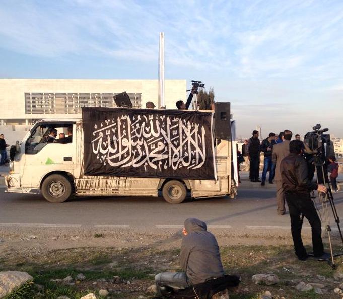 كما رفعوا رايات ورايات "لا اله الا الله مجمد رسول الله"، داعين الى اسقاط النظام السوري وائتلاف المعارضة ودعم الفصائل المسلحة الإسلامية.