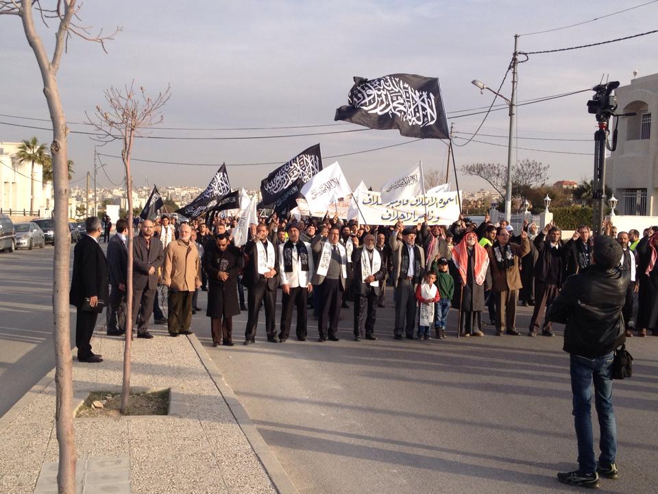 اعتصم المئات من أعضاء حزب التحرير الاسلامي المحظور عصر الأربعاء أمام السفارة السورية في عبدون، رفضاً لمؤتمر جنيف 2 الذي انطلق بحضور المعارضة والنظام السوريين.