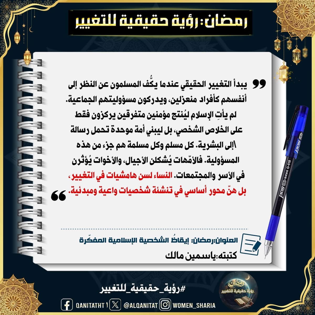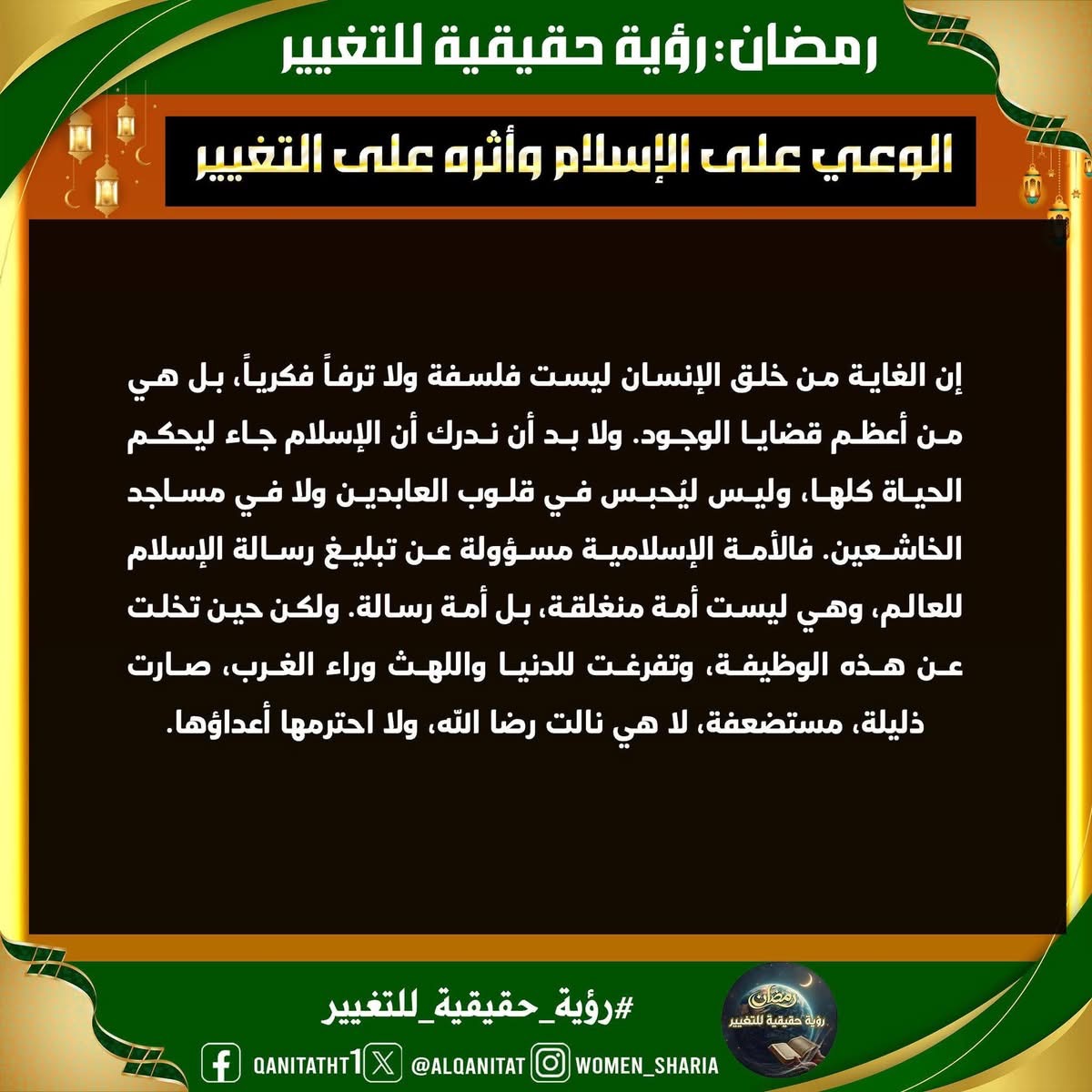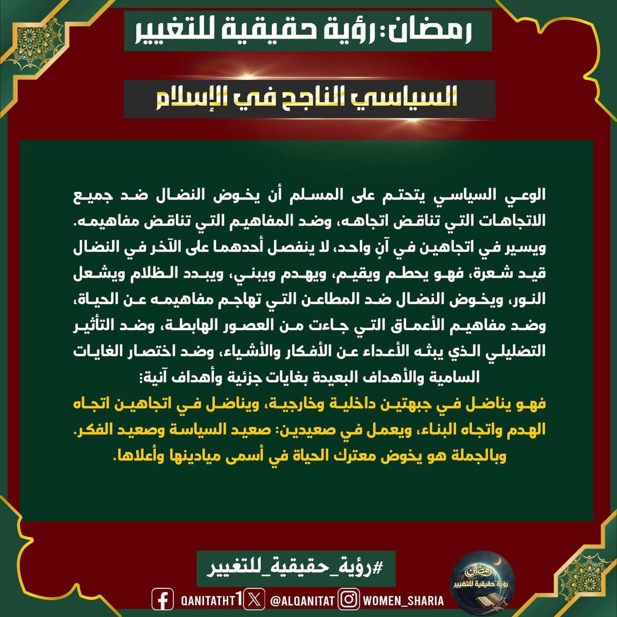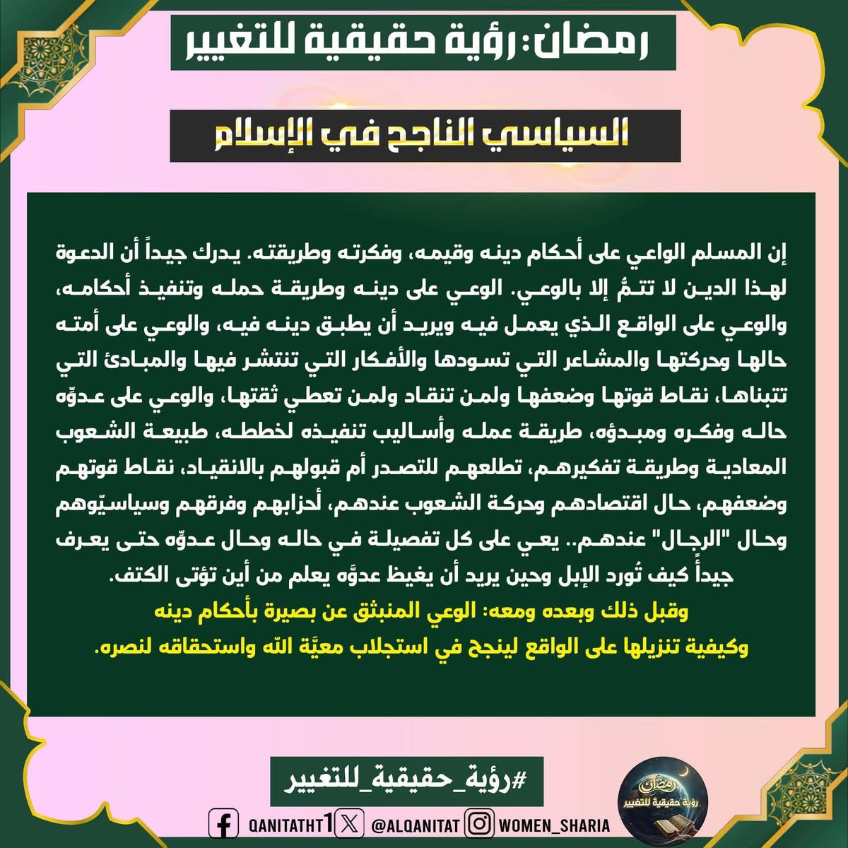 في هذا الشّهر الفضيل، سيتناولُ القسم النسائي في المكتب الإعلامي المركزي لحزب التحرير هذا الموضوع، بما في ذلك الصّفات والتغييرات المطلوبة في أنفسنا بوصفنا مسلمين، وأمة إسلامية، وفي أحزابنا السياسية، وجيوشنا، وعلى مستوى الدولة، لتحقيق هذه الرؤية الحقيقية للتغيير، بالإضافة إلى العقبات التي تعترضُ سبيل تحقيقها وكيفية التغلب عليها.