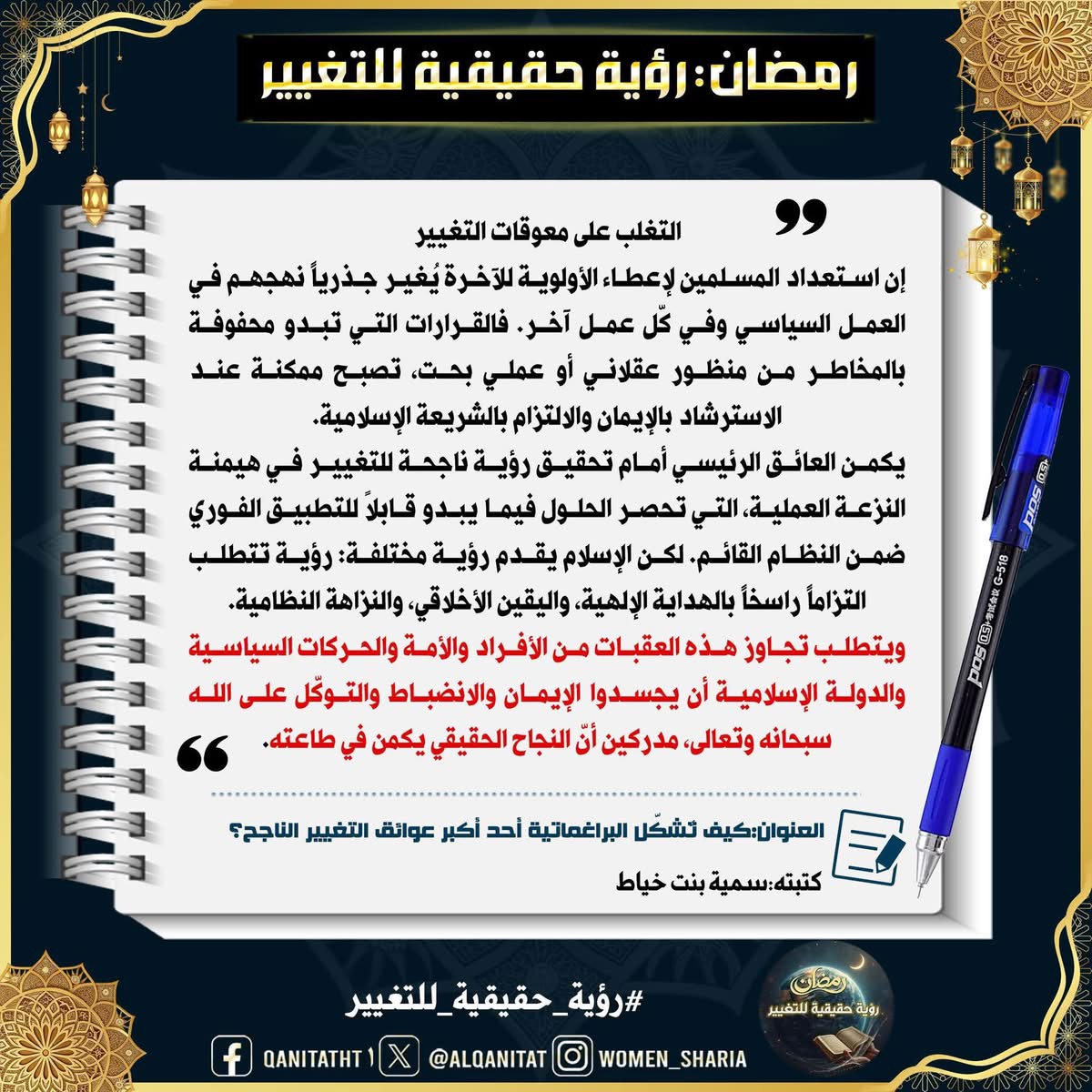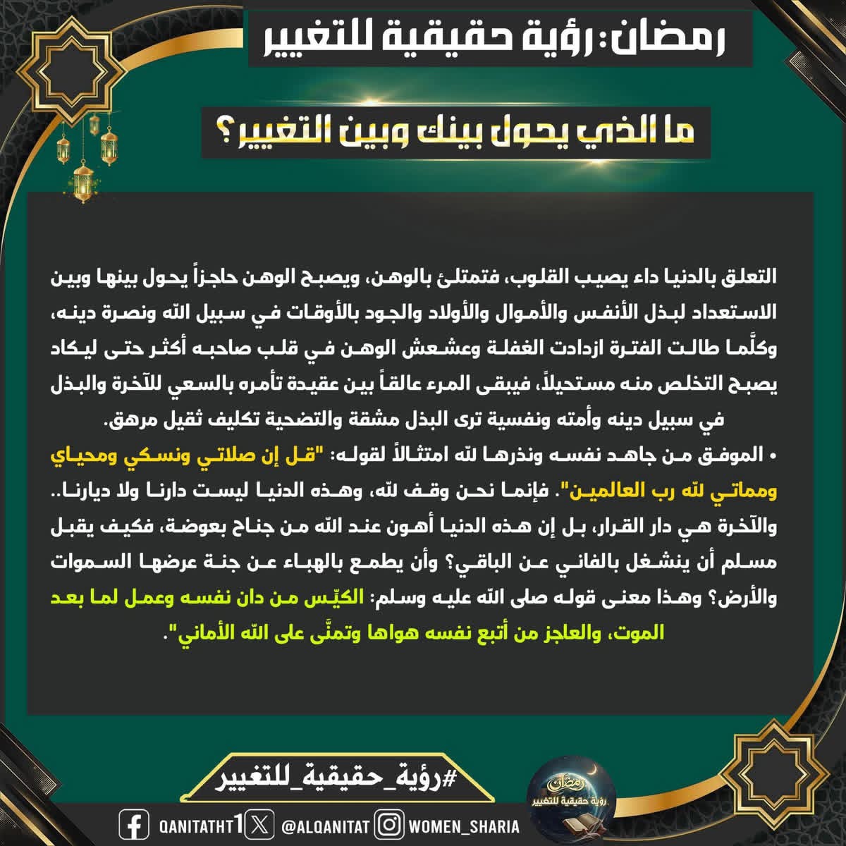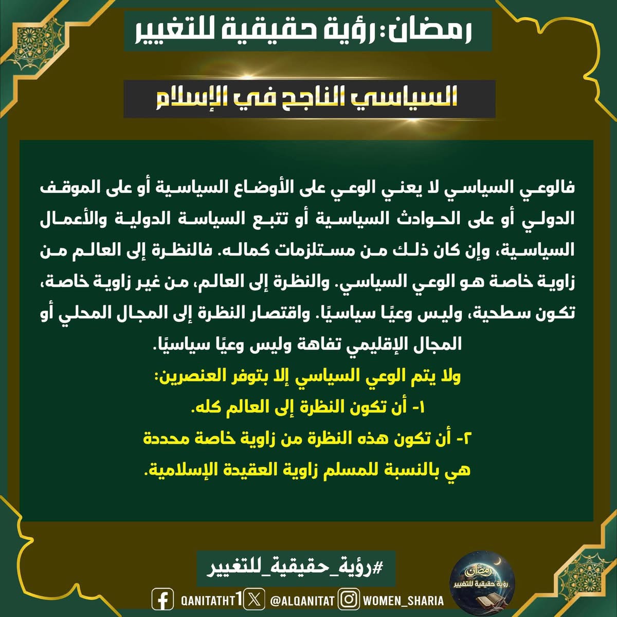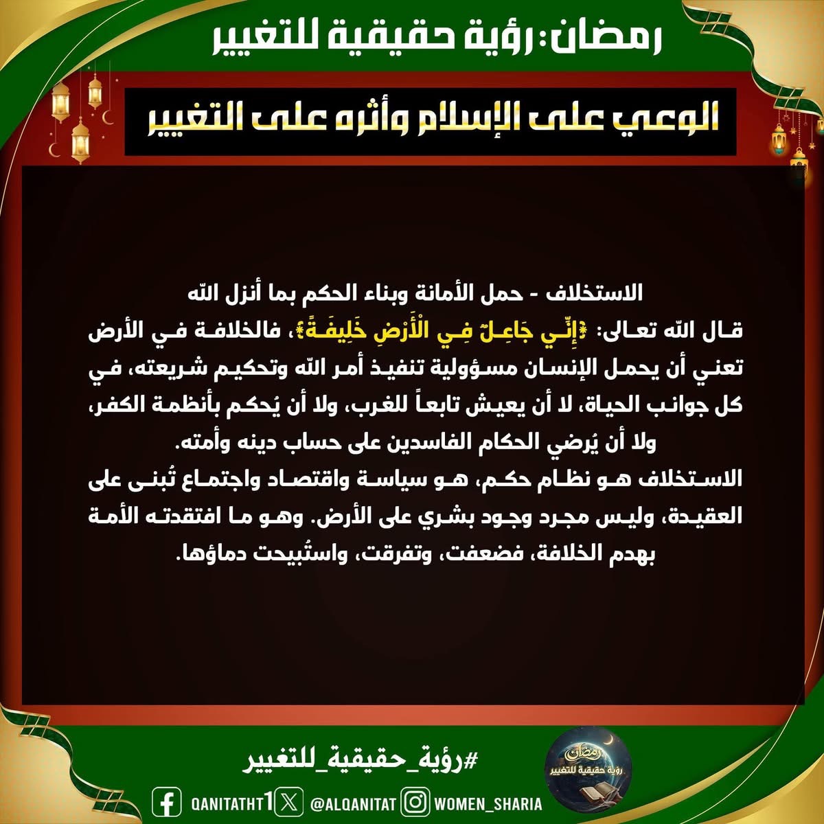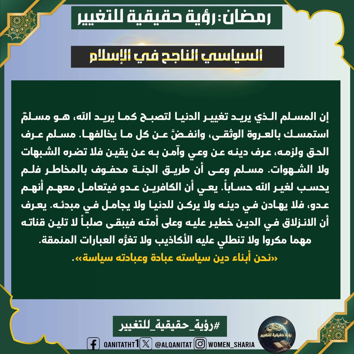 في هذا الشّهر الفضيل، سيتناولُ القسم النسائي في المكتب الإعلامي المركزي لحزب التحرير هذا الموضوع، بما في ذلك الصّفات والتغييرات المطلوبة في أنفسنا بوصفنا مسلمين، وأمة إسلامية، وفي أحزابنا السياسية، وجيوشنا، وعلى مستوى الدولة، لتحقيق هذه الرؤية الحقيقية للتغيير، بالإضافة إلى العقبات التي تعترضُ سبيل تحقيقها وكيفية التغلب عليها.