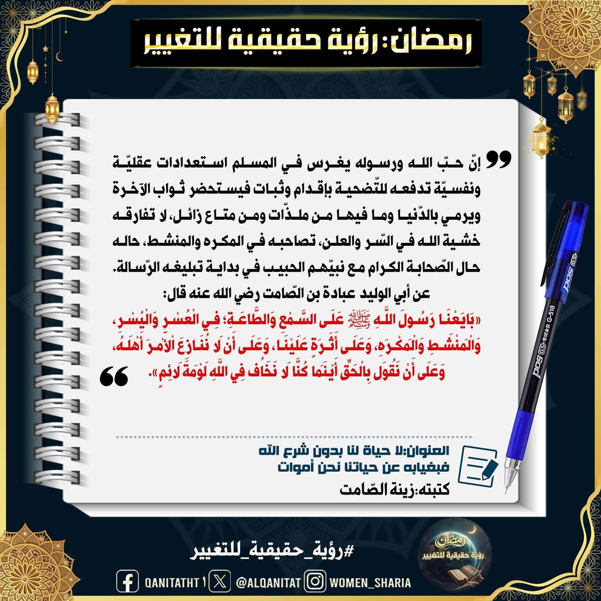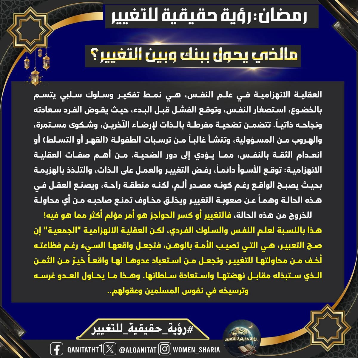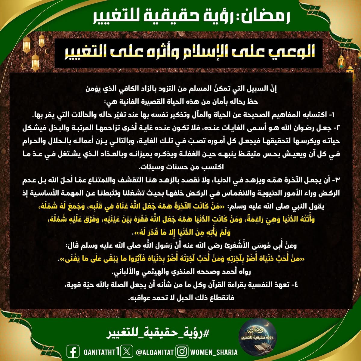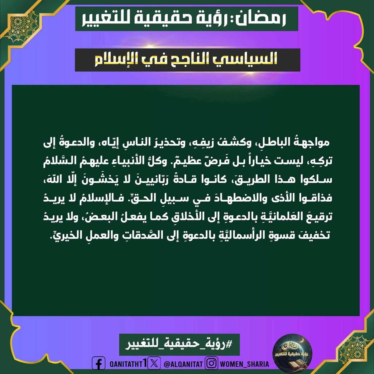 في هذا الشّهر الفضيل، سيتناولُ القسم النسائي في المكتب الإعلامي المركزي لحزب التحرير هذا الموضوع، بما في ذلك الصّفات والتغييرات المطلوبة في أنفسنا بوصفنا مسلمين، وأمة إسلامية، وفي أحزابنا السياسية، وجيوشنا، وعلى مستوى الدولة، لتحقيق هذه الرؤية الحقيقية للتغيير، بالإضافة إلى العقبات التي تعترضُ سبيل تحقيقها وكيفية التغلب عليها.