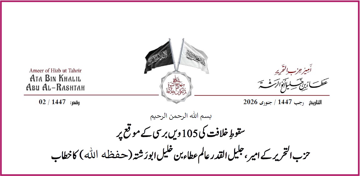 اس سال رجب کے مقدس مہینے، 1447 ہجری (2026 عیسوی) میں، ہم عرب اور ترکی کے غداروں، کافر (کافر) استعمار کے ایجنٹوں کے ہاتھوں اسلامی ریاست کی تباہی کی 105 ویں سالگرہ کی یاد مناتے ہیں۔ یہ ریاست آقا محمد صلی اللہ علیہ وسلم اور ان کے صحابہ کرام رضی اللہ عنہم نے قائم کی تھی۔ اسلامی نظام حکومت (خلافت) کو 28 رجب 1342 ہجری کو مجرم مصطفی کمال کے ہاتھوں 3 مارچ 1924 عیسوی کو ختم کر دیا گیا۔ یہ المناک برسی ہماری طرف واپس آرہی ہے جب کہ غزہ کی پٹی میں بے دفاع مسلمانوں کے خلاف یہودی ادارے کی نسل کشی جاری ہے، جیسا کہ مغربی کنارے میں ہونے والے وحشیانہ قتل عام کا سلسلہ جاری ہے۔ ان مظالم کے نتیجے میں گزشتہ دو سالوں میں 230,000 سے زیادہ مسلمان مرد و خواتین شہید، زخمی اور لاپتہ ہو چکے ہیں، جن میں اکثریت خواتین، بچوں اور بوڑھوں کی ہے۔ مزید برآں، سوڈان میں جاری بے ہودہ اور خونریز جنگ وہاں کے بے گناہ مسلمانوں کی جانیں لے رہی ہے، کفر امریکہ کے مفادات کی تکمیل کے لیے، جس نے دارفور کو سوڈان سے الگ کرنے کے لیے اپنے ایجنٹوں کے درمیان تنازعہ کو ہوا دی، جیسا کہ اس نے پہلے جنوبی سوڈان کو الگ کیا تھا۔