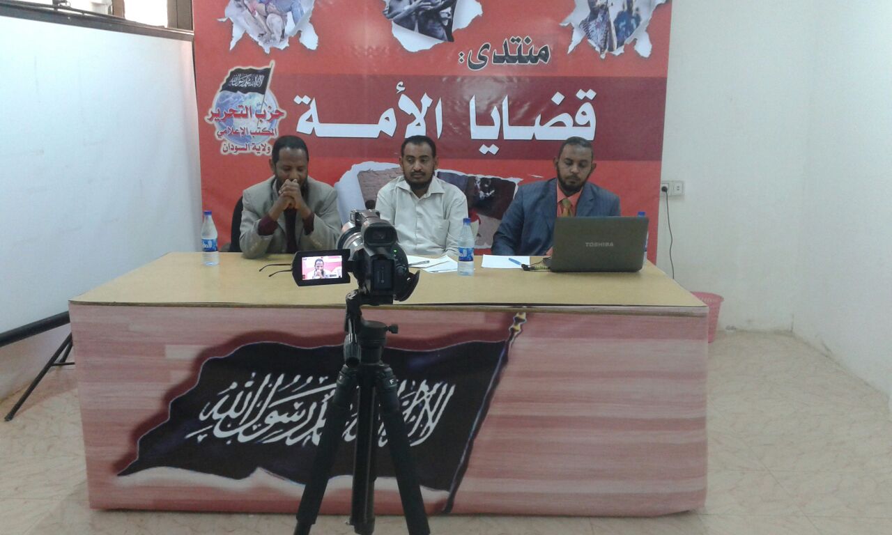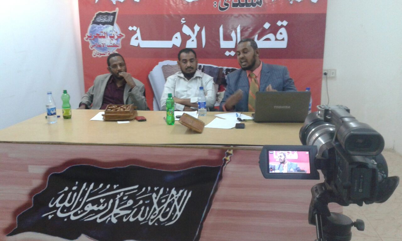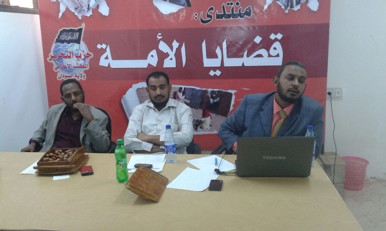 عقد المكتب الإعلامي لحزب التحرير / ولاية السودان منتداه الشهري في 23 نيسان/أبريل 2016م - منتدى قضايا الأمة - والذي جاء هذه المرة تحت عنوان: (الوحدة الإسلامية .. المفهوم والكيفية)، وقد تحدث فيه كل من د. محمد علي الجزولي - المنسق العام لتيار الأمة الواحدة، والأستاذ/ عبد الله عبد الرحمن - عضو مجلس الولاية، وقد قدّم الحضور العديد من المقترحات في سبيل وحدة الأمة الإسلامية، منها ضرورة مواصلة الحديث في موضوع وحدة الأمة، وكيفيتها، ودعوة كافة القوى السياسية، والدعوية في البلاد لكتابة أوراق تبين كيفية الوحدة، على أن تناقش تلك الأوراق باستفاضة وتروٍ، حتى تتبلور رؤية تفضي إلى توحد الأمة على أساس الإسلام.