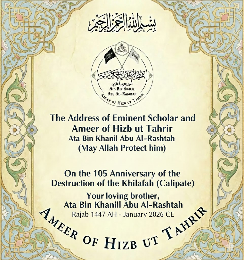 في الذكرى الـ105، تجديد الدعوة لكل قوى الأمة أن تحشد طاقاتها لإقامة الخلافة الراشدة 12 رجب المحرم 1447هـ الموافق 01 كانون الثاني/يناير 2026م