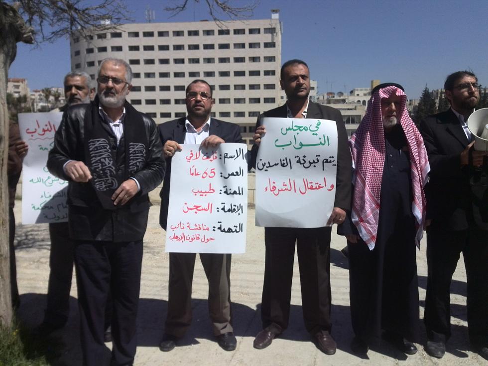 نظَّم حزب التحرير / ولاية الأردن وقفة أمام مجلس النواب الأردني للتنديد بقيام أجهزة الأمن يوم الثلاثاء 2014/03/25م باعتقال اثنين من أعضاء الحزب من داخل مبنى مجلس النواب وتحويلهما إلى محكمة أمن الدولة؛ وهما الطبيب نايف عمر لافي (65 عاما) والأستاذ إبراهيم محمود الخرابشة (55 عاما)، حيث كانا من ضمن وفد رسمي للحزب قام بالتواصل مع نواب المجلس وسلموهم بيانا من الحزب يبين موقفه الرافض لمشروع القانون المعدل لقانون منع الإرهاب والتحذير منه ومنع تمريره.