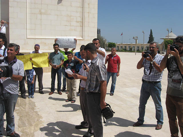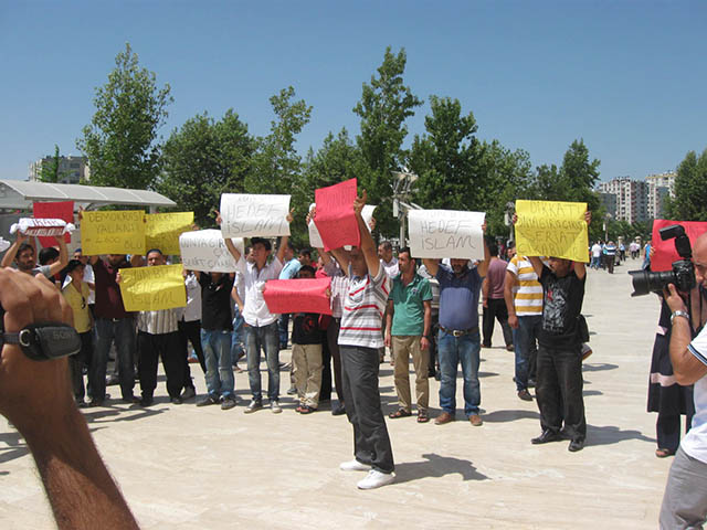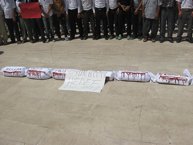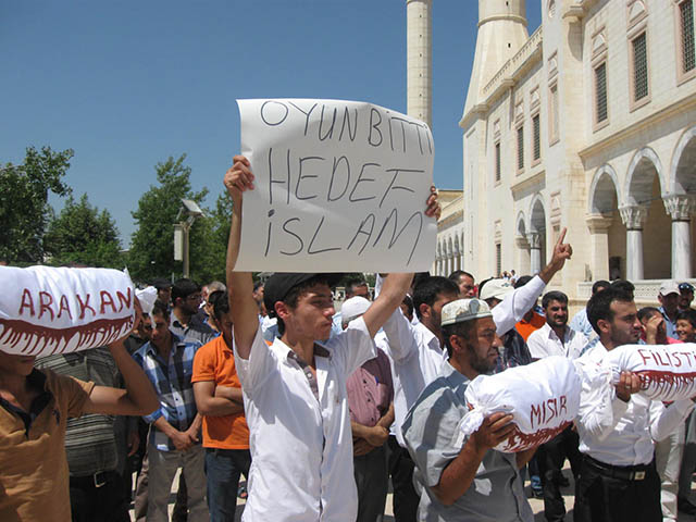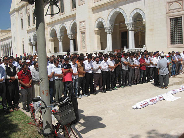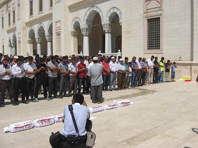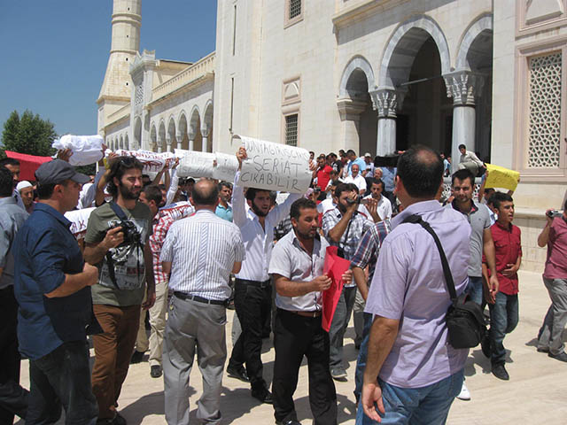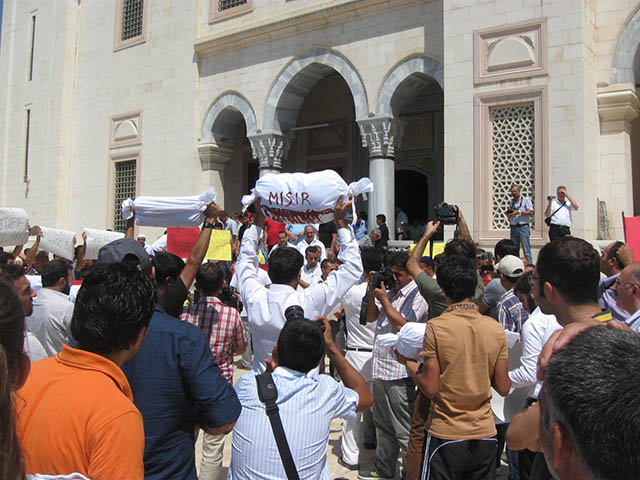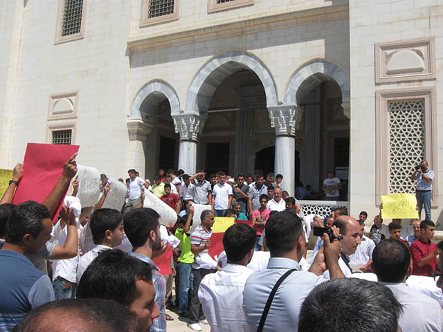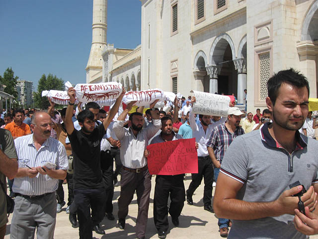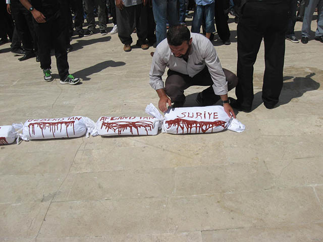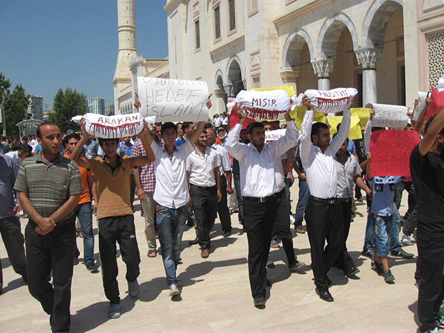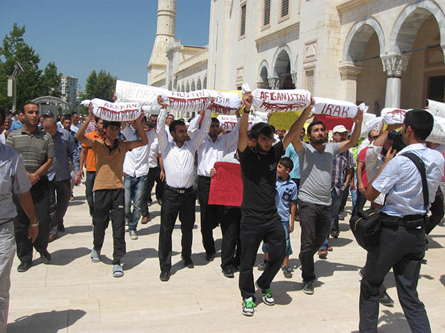 نظم شباب وأنصار حزب التحرير / ولاية تركيا في جامع صابانجي بمدينة أضنة اعتصاماً عقب صلاة الجمعة رفعوا فيه اليافطات المنددة بقتل المسلمين العزل في مصر والشام وفلسطين والعراق وأفغانستان وفي غيرها من بلاد المسلمين.. وأدووا بعدها صلاة الغائب على قتلى المسلمين في مصر والشام.