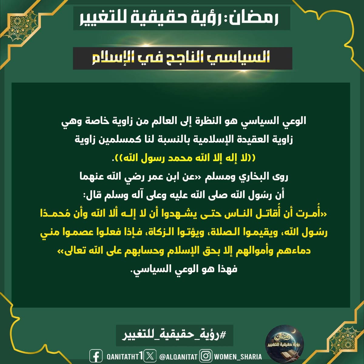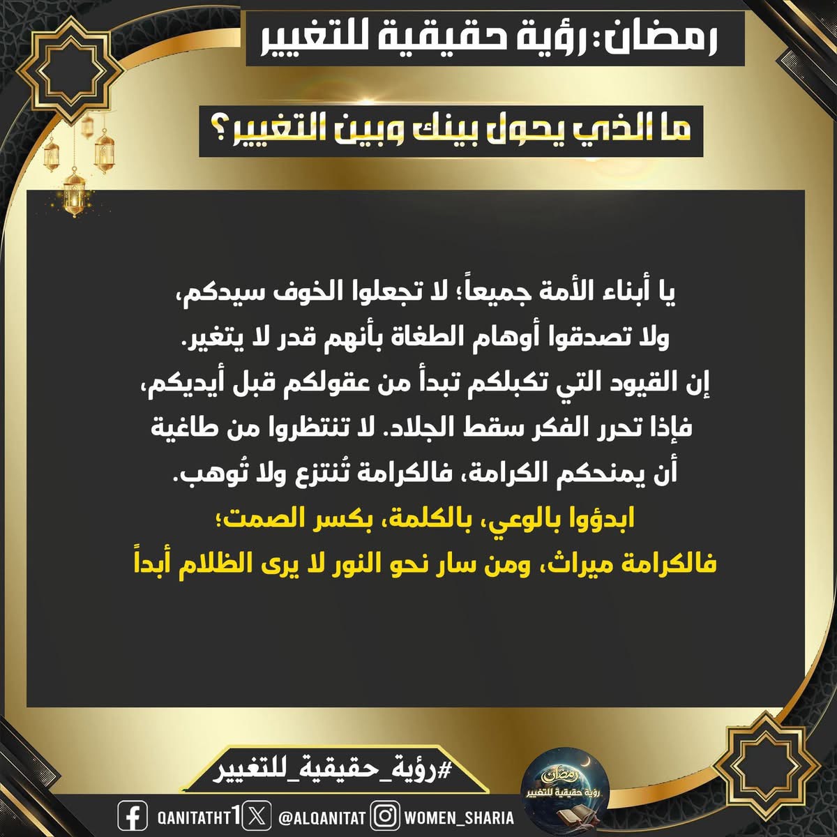 في هذا الشّهر الفضيل، سيتناولُ القسم النسائي في المكتب الإعلامي المركزي لحزب التحرير هذا الموضوع، بما في ذلك الصّفات والتغييرات المطلوبة في أنفسنا بوصفنا مسلمين، وأمة إسلامية، وفي أحزابنا السياسية، وجيوشنا، وعلى مستوى الدولة، لتحقيق هذه الرؤية الحقيقية للتغيير، بالإضافة إلى العقبات التي تعترضُ سبيل تحقيقها وكيفية التغلب عليها.