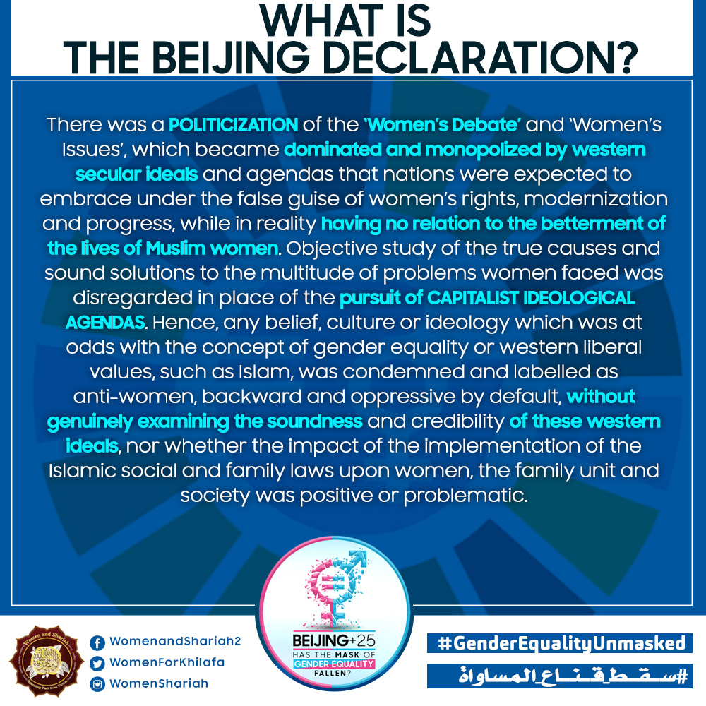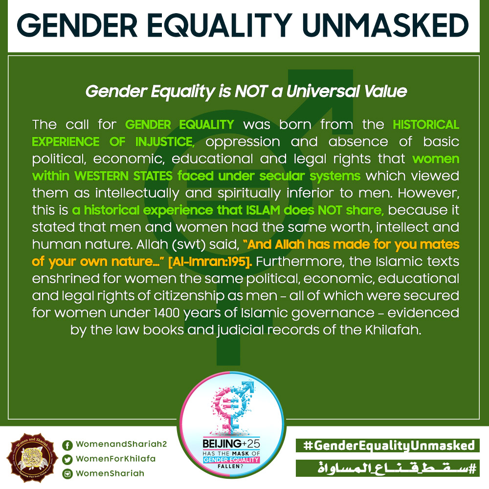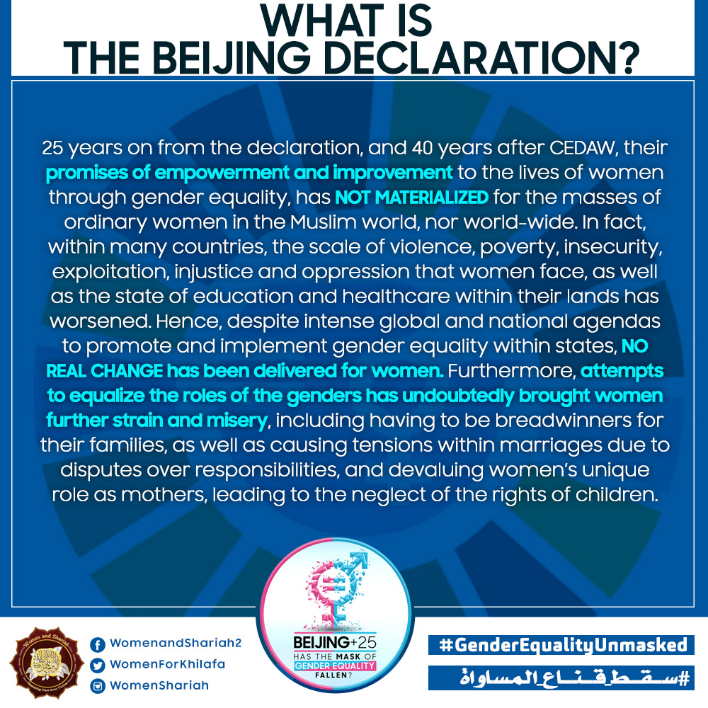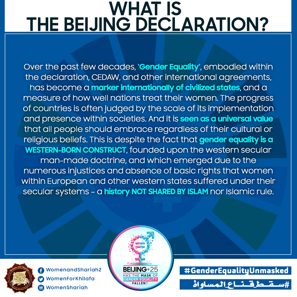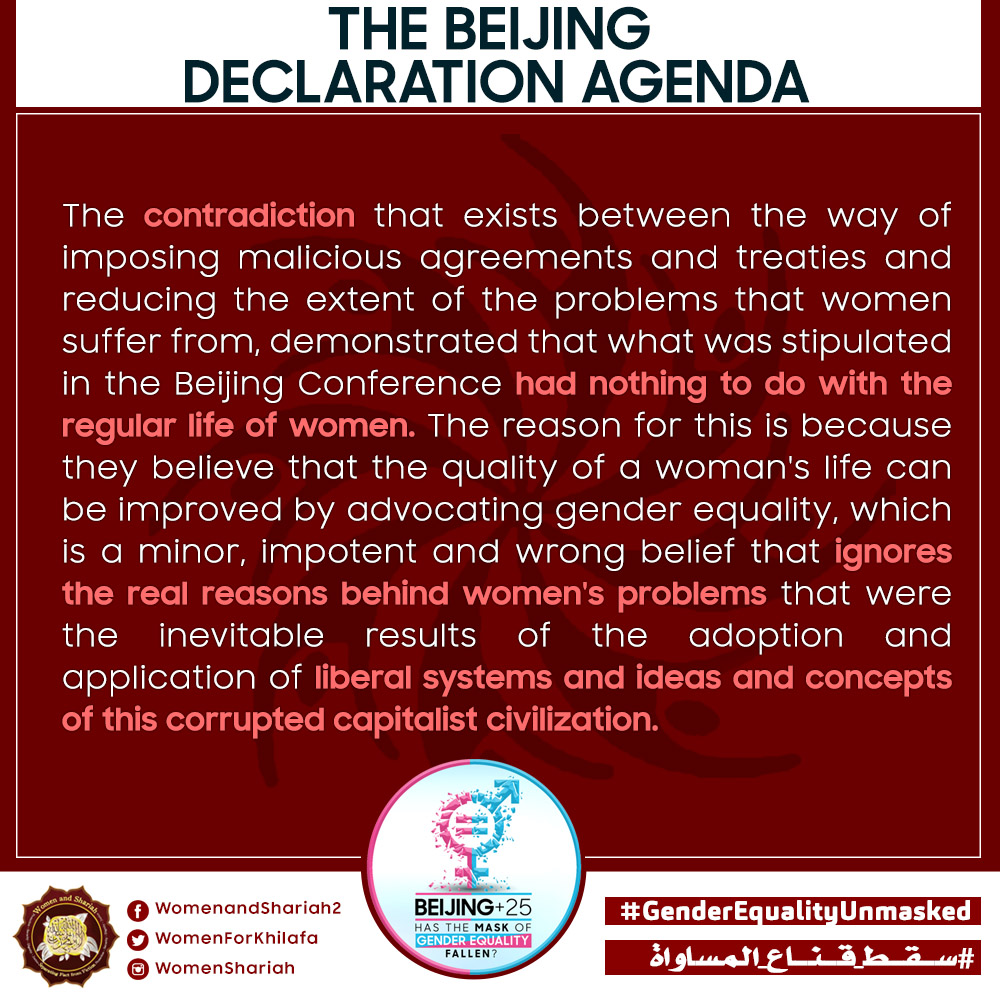 This March, the Women’s Section in the Central Media Office of Hizb ut Tahrir launched a global campaign entitled, “Beijing+25: Has the Mask of Gender Equality Fallen?” The campaign will seek to challenge the dominant narratives of ‘Gender Equality’ and its claims of advancing women’s rights and the progress of nations, and present Islam’s unique comprehensive blueprint of detailed principles, laws and systems as implemented by its political system, the Khilafah (Caliphate) based upon the method of the Prophethood, that would provide an alternative credible vision to raise the status of women, secure their rights, elevate their standard of living and achieve true progress within a state.
