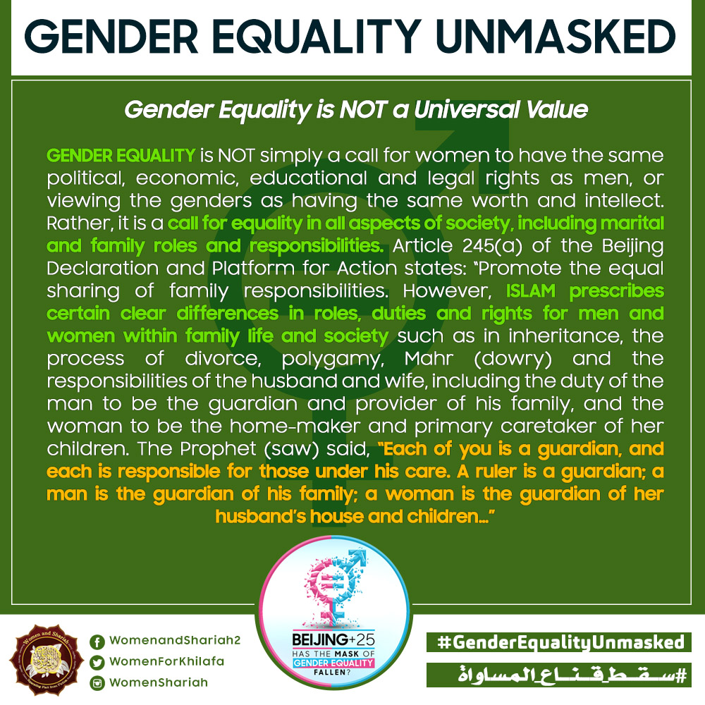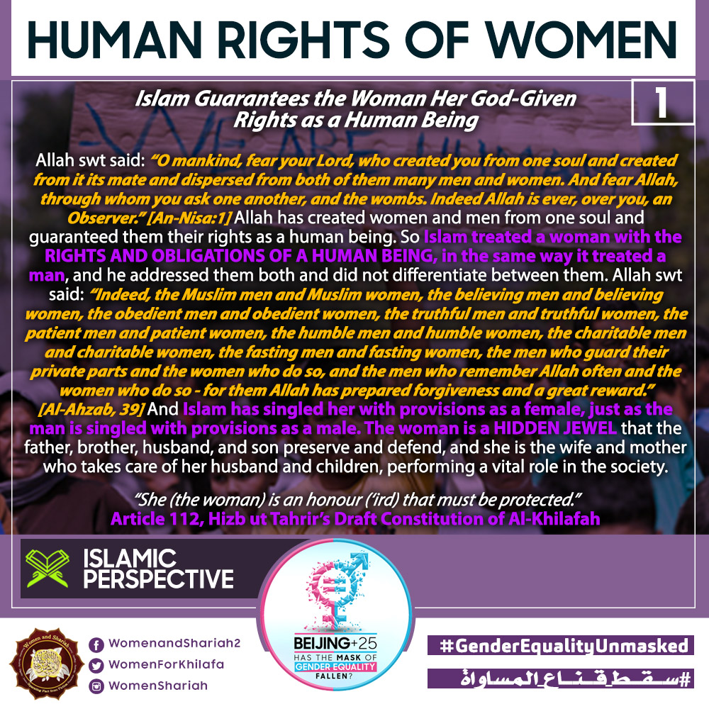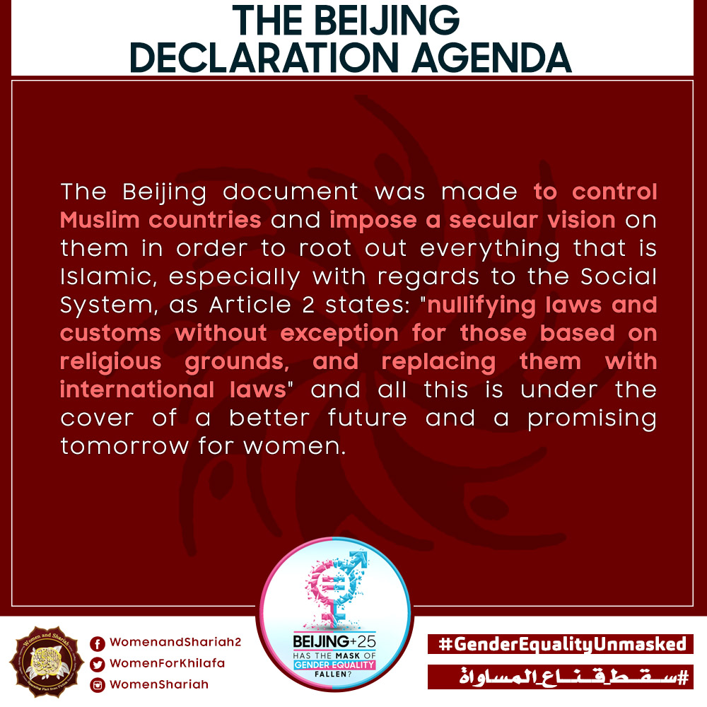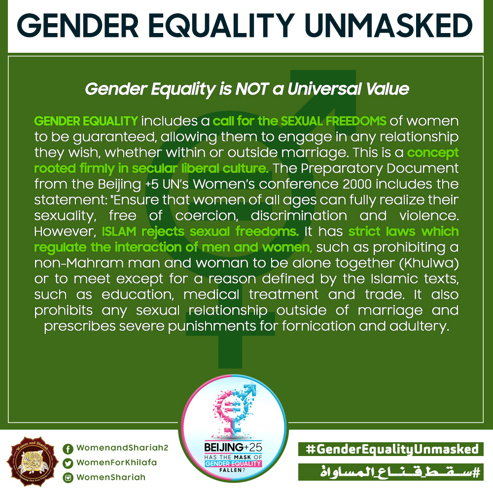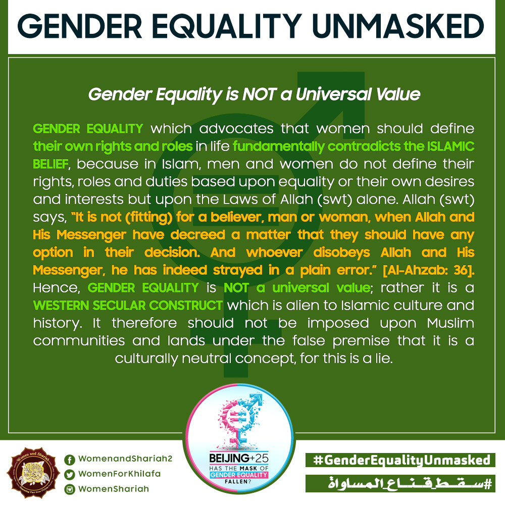 This March, the Women’s Section in the Central Media Office of Hizb ut Tahrir launched a global campaign entitled, “Beijing+25: Has the Mask of Gender Equality Fallen?” The campaign will seek to challenge the dominant narratives of ‘Gender Equality’ and its claims of advancing women’s rights and the progress of nations, and present Islam’s unique comprehensive blueprint of detailed principles, laws and systems as implemented by its political system, the Khilafah (Caliphate) based upon the method of the Prophethood, that would provide an alternative credible vision to raise the status of women, secure their rights, elevate their standard of living and achieve true progress within a state.