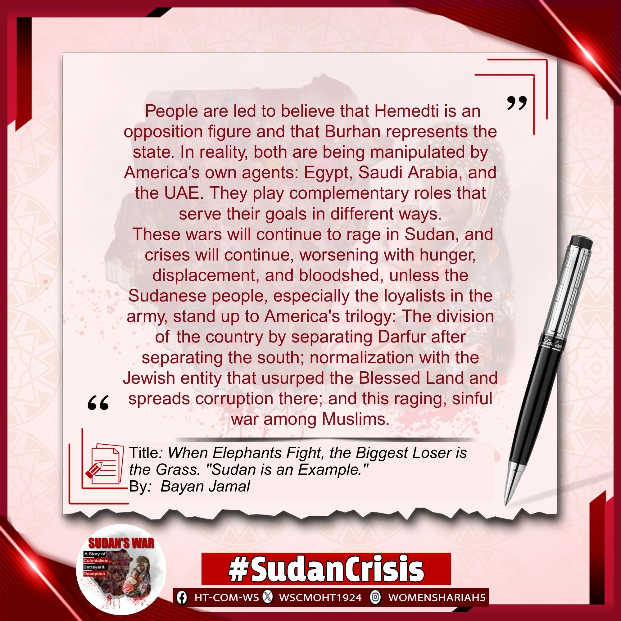 It is part of a global campaign launched by the Women’s Section in the Central Media Office of Hizb ut Tahrir entitled, "Sudan's War: A Story of Colonialism, Betrayal & Deception" that aims to bring an international spotlight on the deteriorating humanitarian catastrophe afflicting the Muslims of Sudan as a result of the current conflict plaguing the country which has been labelled the "Forgotten War"