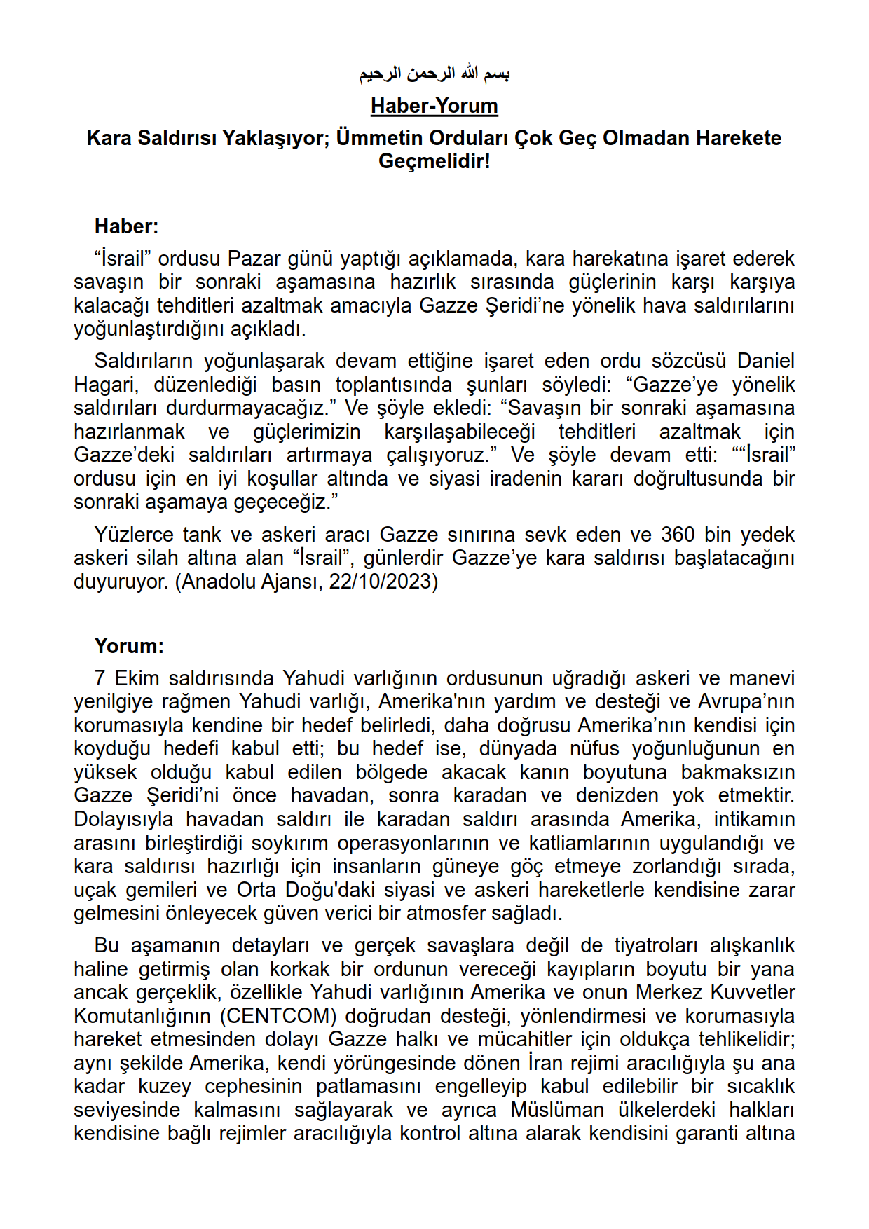 Kara Saldırısı Yaklaşıyor; Ümmetin Orduları Çok Geç Olmadan Harekete Geçmelidir!