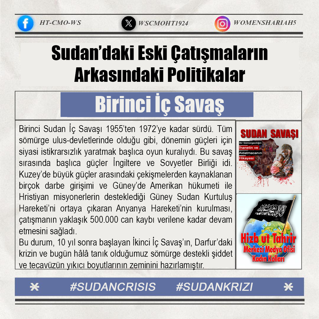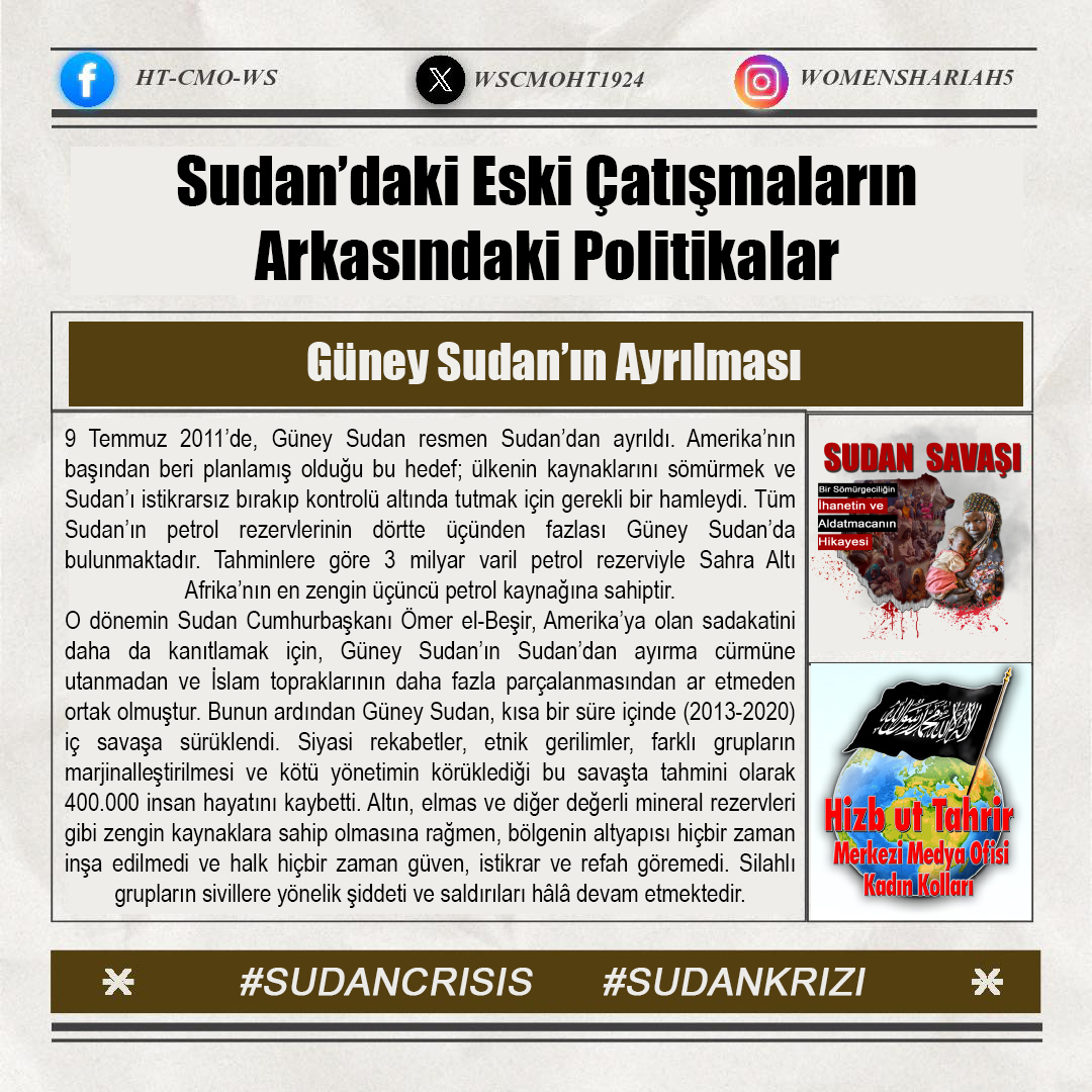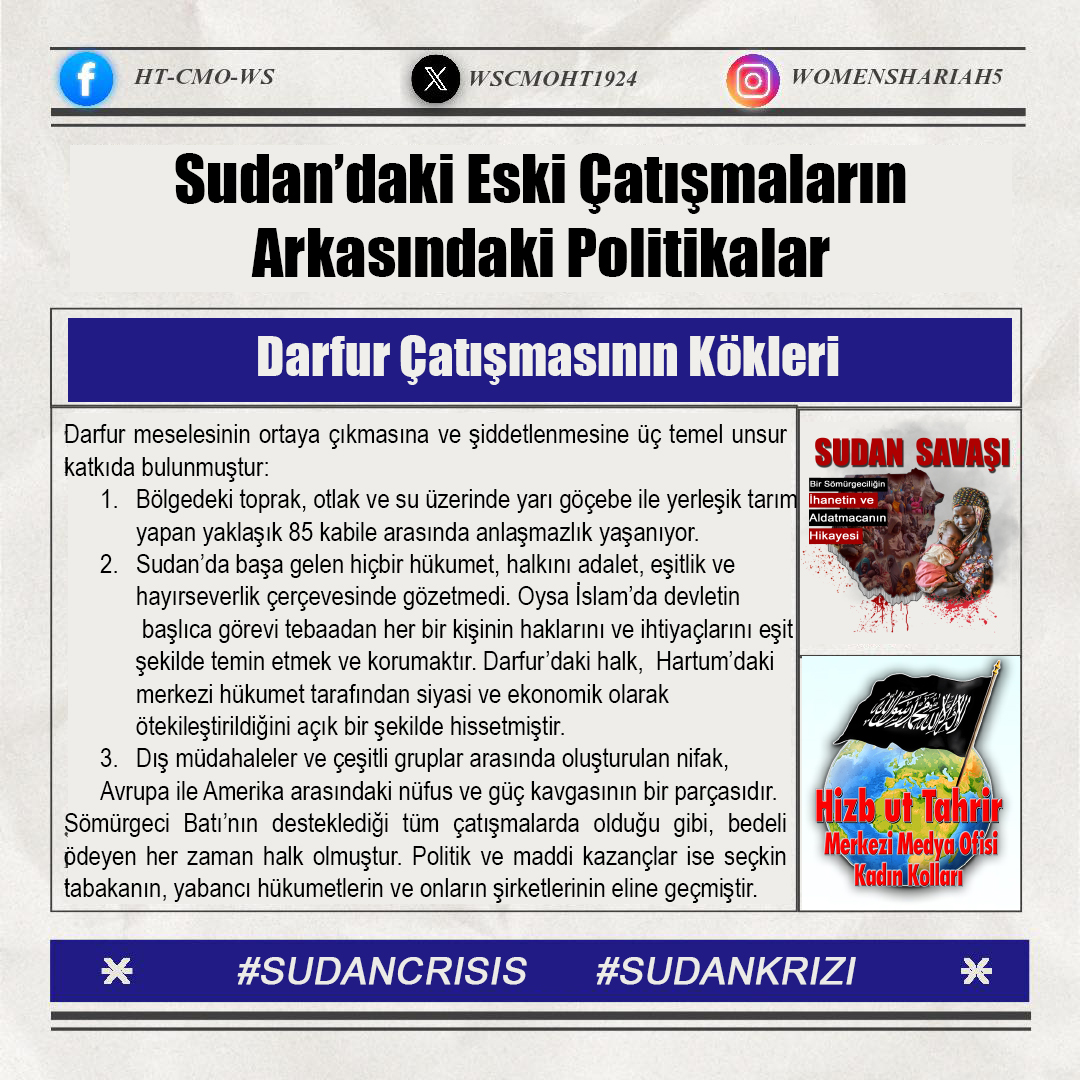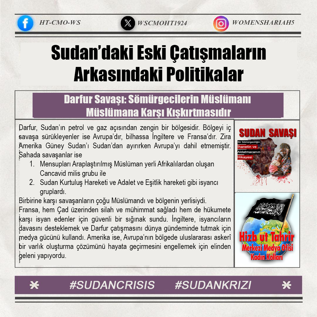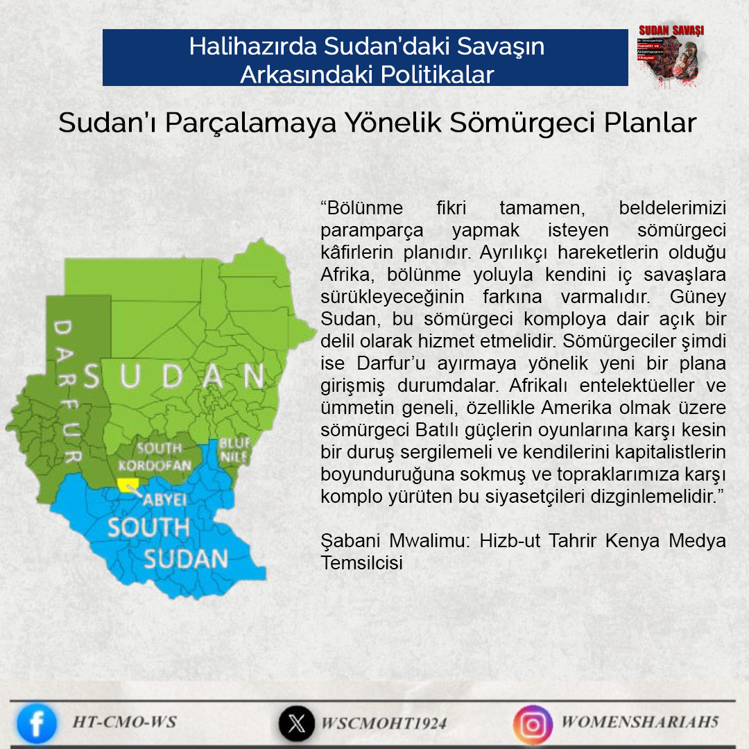 Sudan'daki kardeşlerimizin halini Allah'a şikayet ediyoruz; zira oradaki kardeşlerimizin haksız yere canları alınmakta, kadınlar tecavüze uğramakta ve mülkiyetler çalınmaktadır. Tüm bunlar ise iktidarda olanların ve onlarla savaşanların gözü ve kulağı önünde gerçekleşmektedir; zira onlar kardeşlerimiz hakkında Allah'tan hiç korkmuyorlar; çünkü onların önemsedikleri şey insanların işleri, onların hayatları ve mülkiyetleri değildir, aksine onların önemsedikleri şey, sadece kendi koltukları ve çıkarlarıdır!!