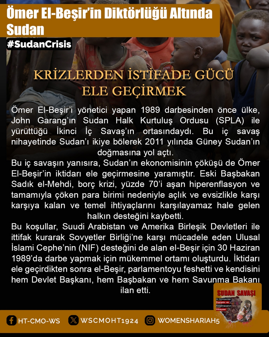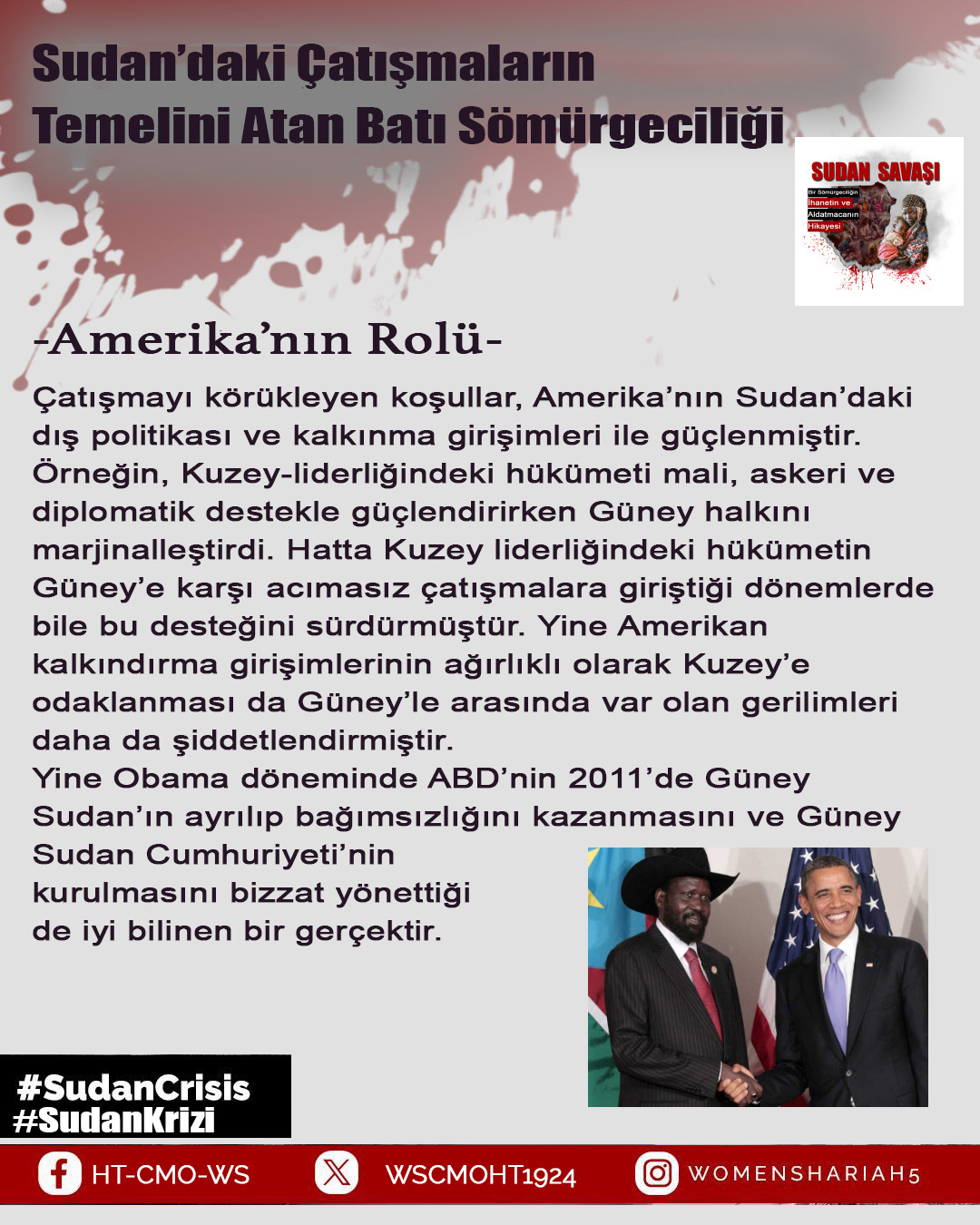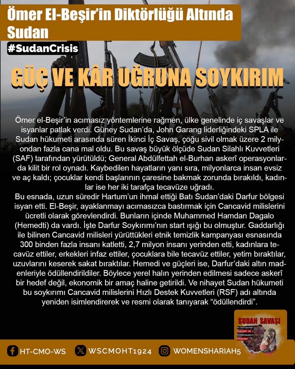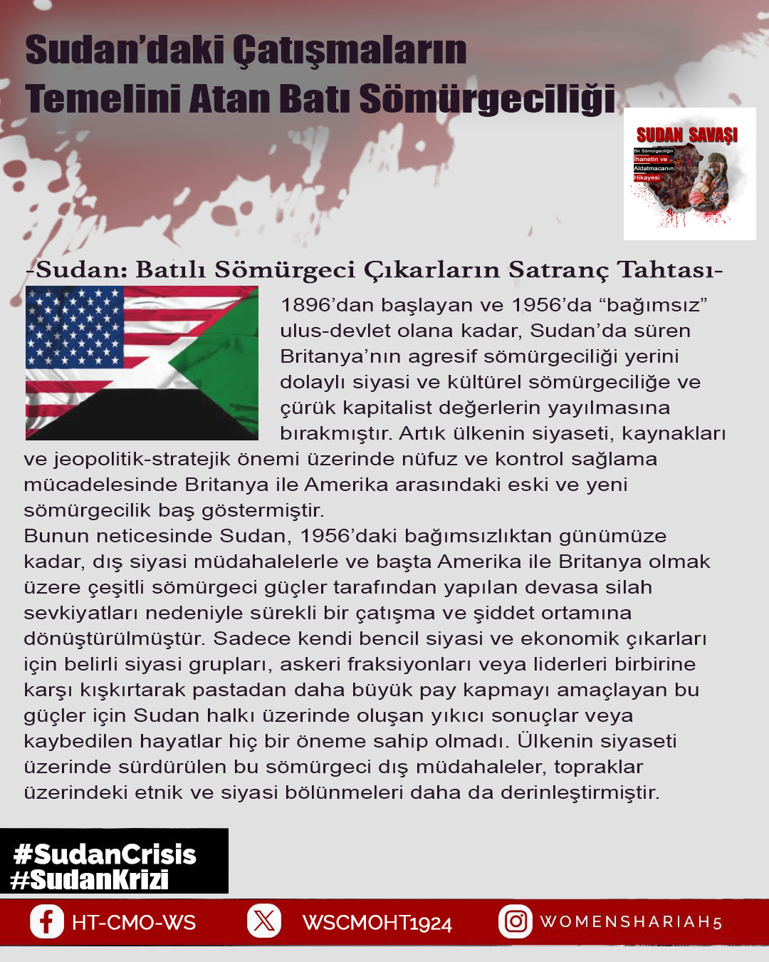 Sudan'daki kardeşlerimizin halini Allah'a şikayet ediyoruz; zira oradaki kardeşlerimizin haksız yere canları alınmakta, kadınlar tecavüze uğramakta ve mülkiyetler çalınmaktadır. Tüm bunlar ise iktidarda olanların ve onlarla savaşanların gözü ve kulağı önünde gerçekleşmektedir; zira onlar kardeşlerimiz hakkında Allah'tan hiç korkmuyorlar; çünkü onların önemsedikleri şey insanların işleri, onların hayatları ve mülkiyetleri değildir, aksine onların önemsedikleri şey, sadece kendi koltukları ve çıkarlarıdır!!