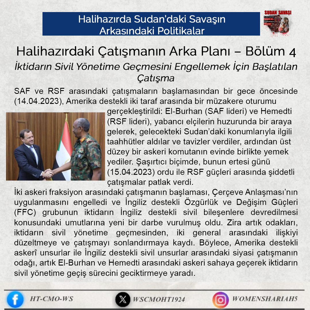 İki yıl önce silahlı kuvvetler ile hızlı destek güçleri arasında başlayan zalim savaşın ardından bugün Sudan'ın ulaştığı vahim durum hiç kimse için bir sır değildir. Ne yazık ki ülkeyi parçalamak ve Amerika, Avrupa ve diğerlerinin çıkarlarını gözetmek amacıyla yerel silahlarla deveran eden bu iğrenç uluslararası çatışmanın bedelini ödeyen ve ödemeye devam edenler masum Sudan halkıdır.