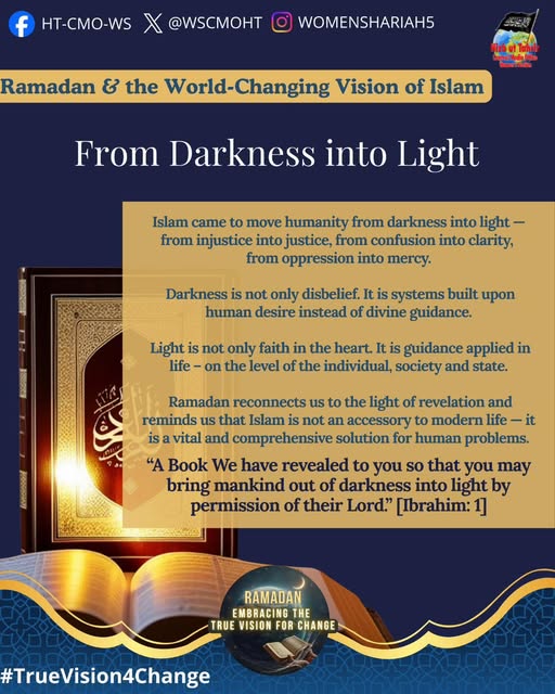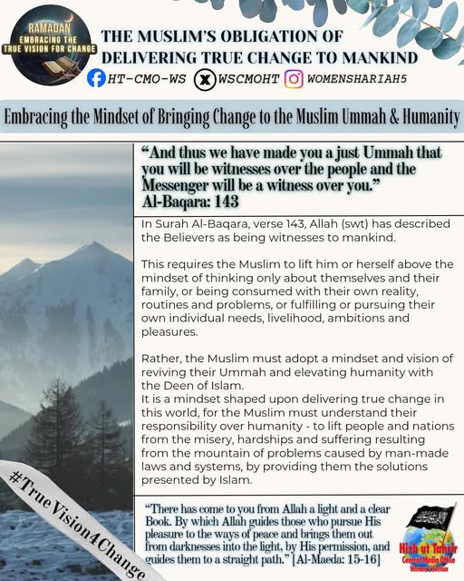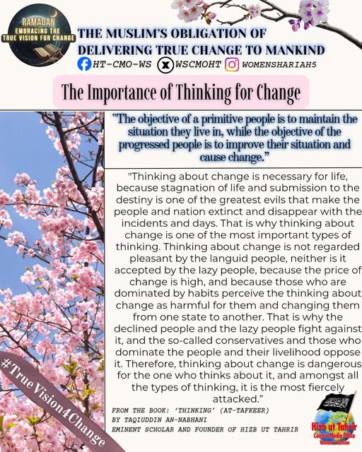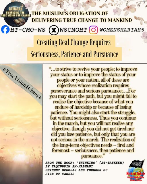 اس بابرکت مہینے میں، حزب التحریر کے مرکزی میڈیا آفس کا خواتین سیکشن اس موضوع پر خطاب کرے گا، جس میں بطور مسلمان، امت اسلامی، ہماری سیاسی جماعتوں، ہماری فوجوں اور ریاستی سطح پر تبدیلی کے اس حقیقی وژن کو حاصل کرنے کے لیے اپنے اندر ضروری خصوصیات اور تبدیلیاں شامل ہیں۔ یہ اس کے حصول کی راہ میں حائل رکاوٹوں اور ان پر قابو پانے کے طریقوں پر بھی بات کرے گا۔